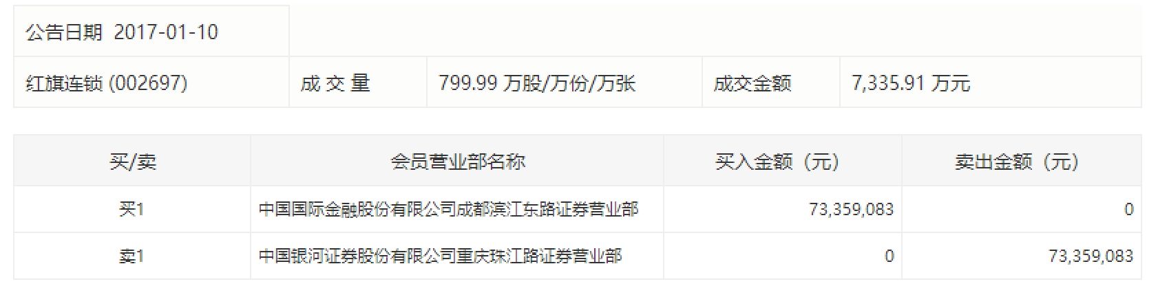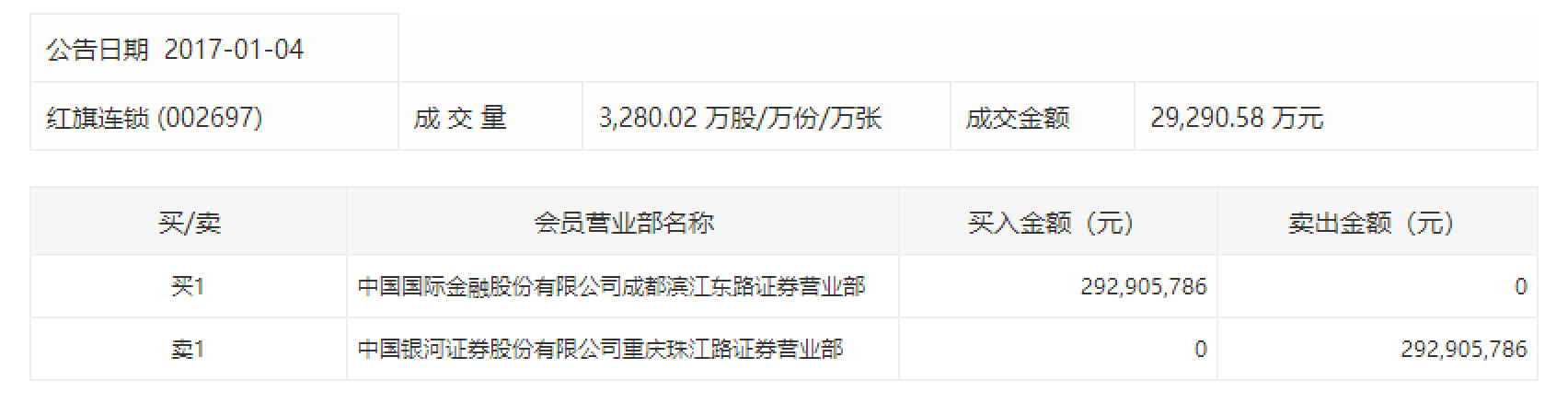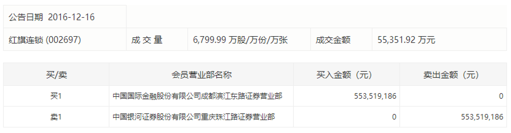 时间回溯到2016年年底,原股东四川三新创业投资有限责任公司(下称四川三新)通过大宗交易减持红旗连锁,接盘方正是中民财智。可以看到,在2016年12月16日四川三新减持了6799.99万股,占红旗连锁总股本的4.9999%,减持均价为8.14元,涉及金额55351.92万元。当时中民财智入手红旗连锁的目的则是“出于对社会零售行业和上市公司未来发展前景的看好”,使用的席位是中金公司成都滨江东路营业部。