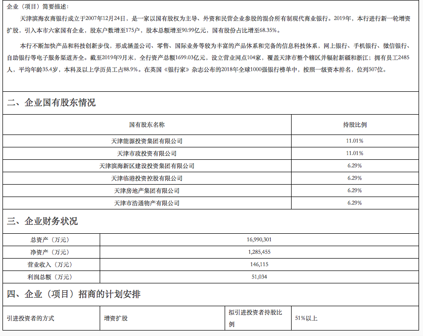 公开信息显示,天津滨海农商行成立于2007年12月24日,是一家以国有股权为主导、外资和民营企业参股的混合所有制现代商业银行。2019年引进六家国有企业后,股东户数增至175户,股本总额增至90.99亿元,国有股份占比增至68.35%。