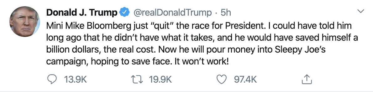 布隆伯格退选的消息宣布后,总统特朗普立刻在推特上嘲讽道,“迷你迈克刚刚‘退出’了总统竞选。我本该很早前就告诉他,他根本没有成功的条件,那样他就可以省下十亿美元了,血本无归了。现在他准备把钱继续投给瞌睡乔,希望可以挽回颜面。行不通的!”