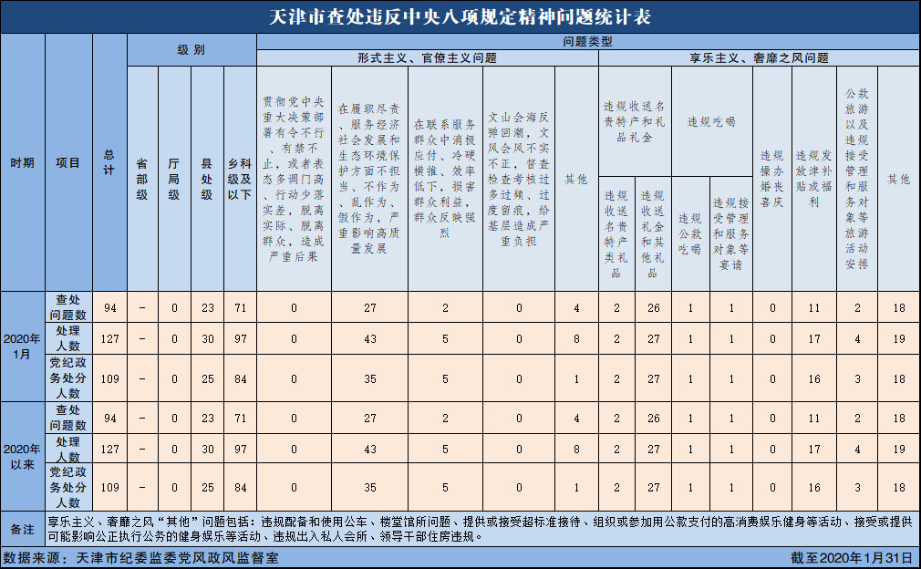 2020年以来,截至1月31日,天津市查处违反中央八项规定精神问题情况如下: