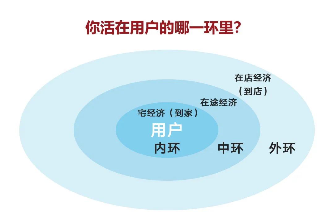 在店经济位于最外环,用户只有到店才会和企业发生关系。用户如果不到店,企业所有的付出都是徒劳无功。疫情期间,很多企业将门店关闭后,和用户之间唯一的连接器也失去了;在途经济位于中环,和用户的连接更为紧密;宅经济位于内环,和用户的连接是最紧密的。企业要不断审视,看自己到底位于用户生活圈的哪一环。