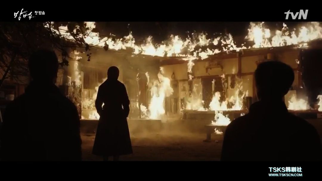 深夜,巫女在庭院中喝酒,突然来了一帮人,将巫女杖杀,又点火烧屋。