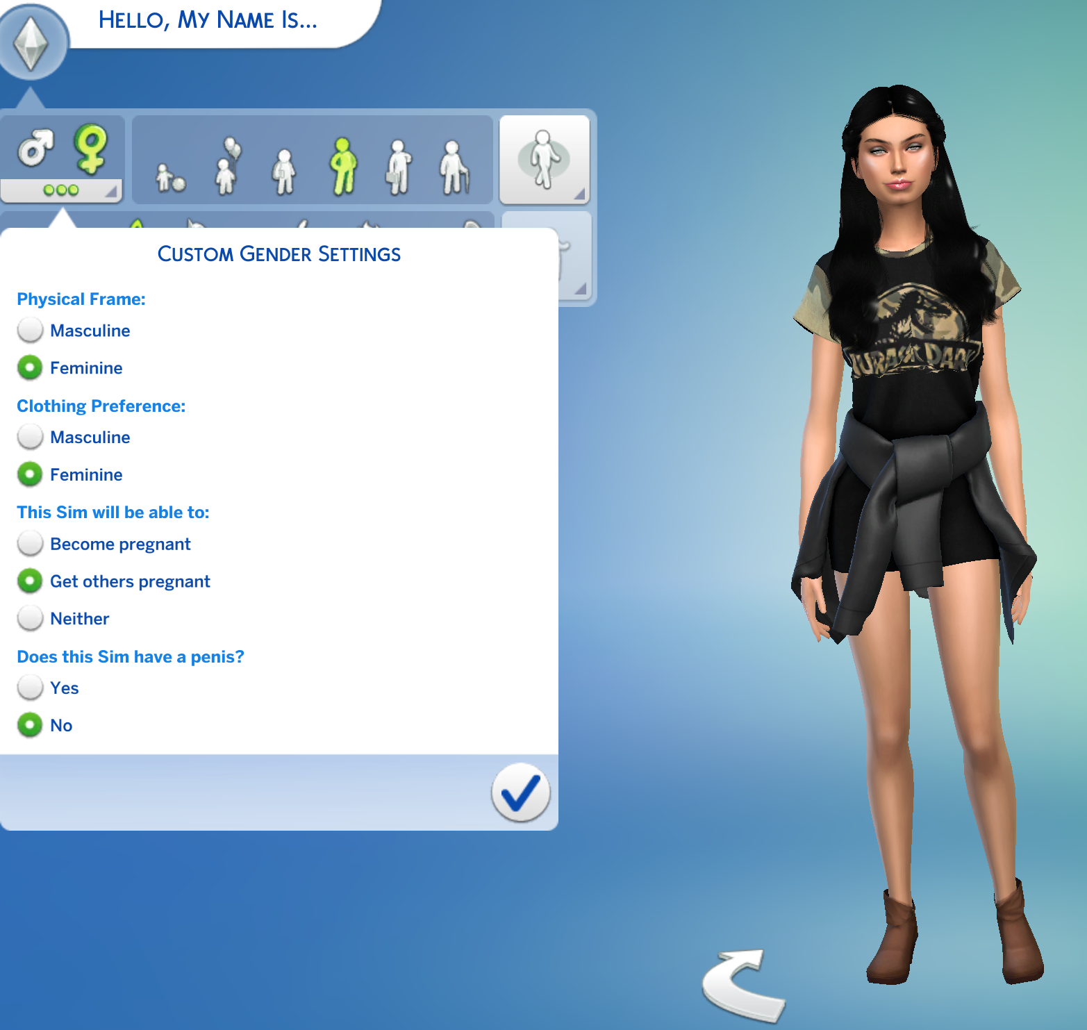 在《模拟人生4》中,捏小人时已经可以选择他/她的生育属性,是可以令别人怀孕,还是自己受孕,是坐着还是站着上厕所,也可以自由搭配女性化(feminie)或者男性化(masculine)的服装。也就是说,模拟市民的性别不能完全根据外表来判定,所以也有玩家突然会发现某个看起来非常男性化的角色其实没有性别,也没有使他人怀孕的能力。此外,第四代的造人界面还添加了外星人(occult)选项,你可以自己设计一个外星人出来,也可以根据基因造出模拟小人的父母、兄妹或子女。