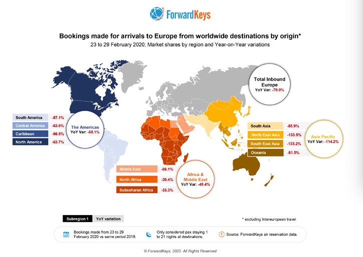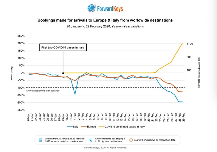 旅游趋势分析公司ForwardKeys最新报告显示,截至2月最后一周,新冠病毒感染的肺炎疫情已对意大利和欧洲的入境旅客数量产生巨大冲击,大批预定取消,并且从全球其他洲前往欧洲的新增机票预定也断崖式下跌。