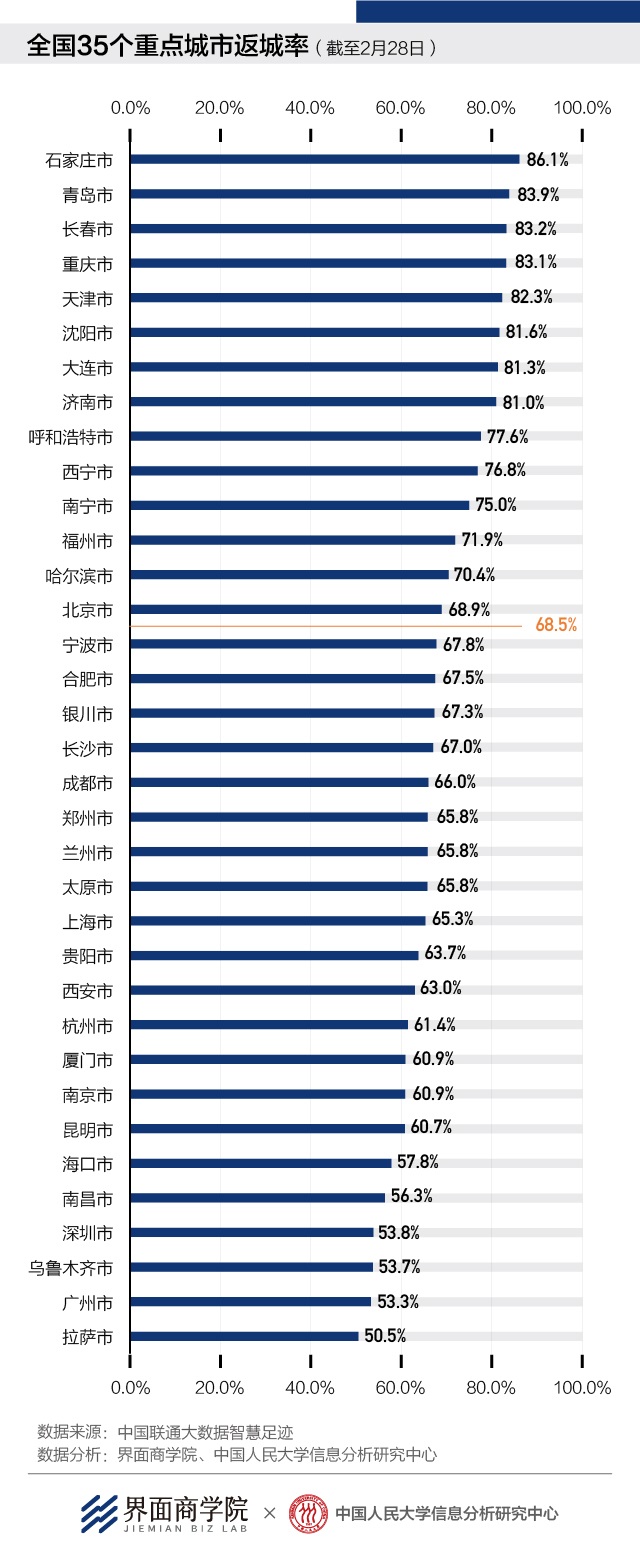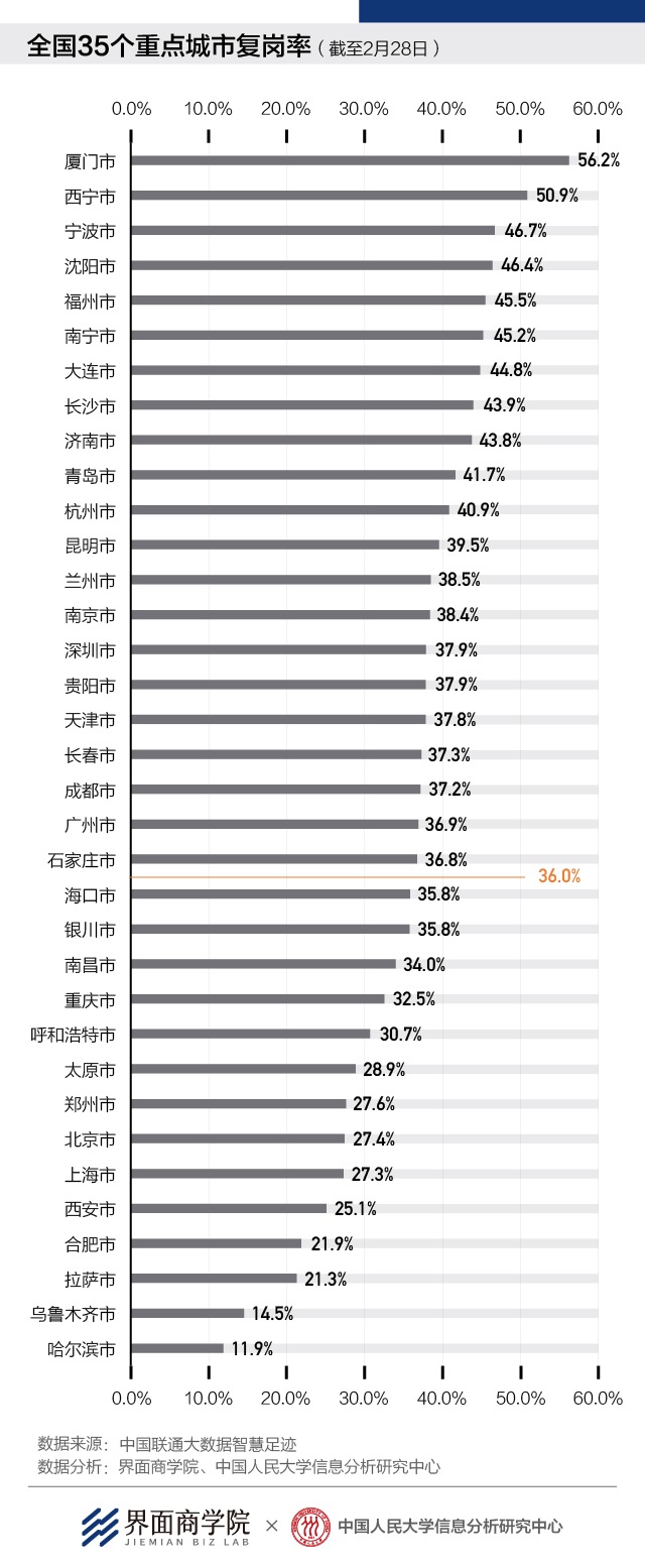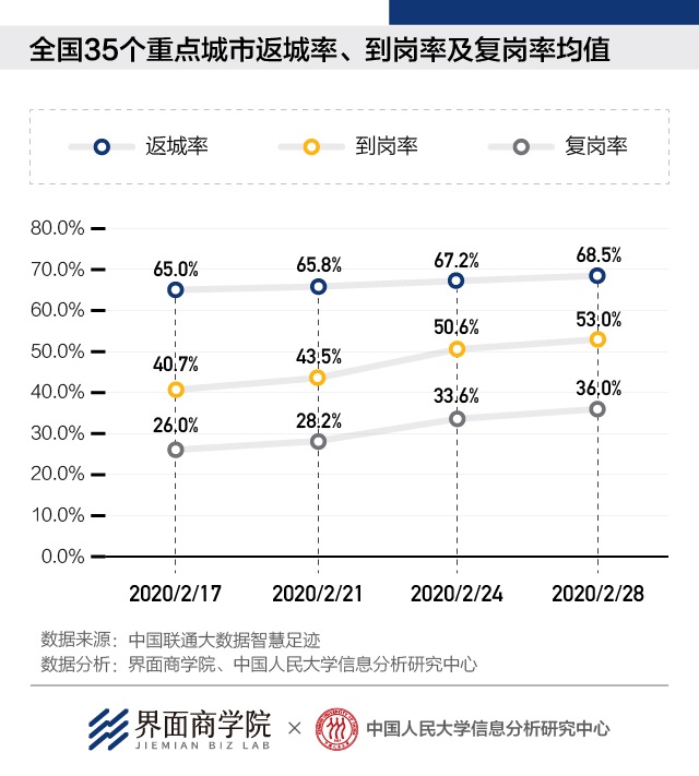 为此,界面商学院联合中国人民大学信息分析研究中心、中国联通大数据智慧足迹以及BOSS直聘,试图通过“返城率”、“到岗率”和“复岗率”等衡量实际复工程度的指标,对全国35个重点城市(直辖市、省会和计划单列市,武汉除外)的复岗进度、复岗难度和招聘力度进行综合评估。