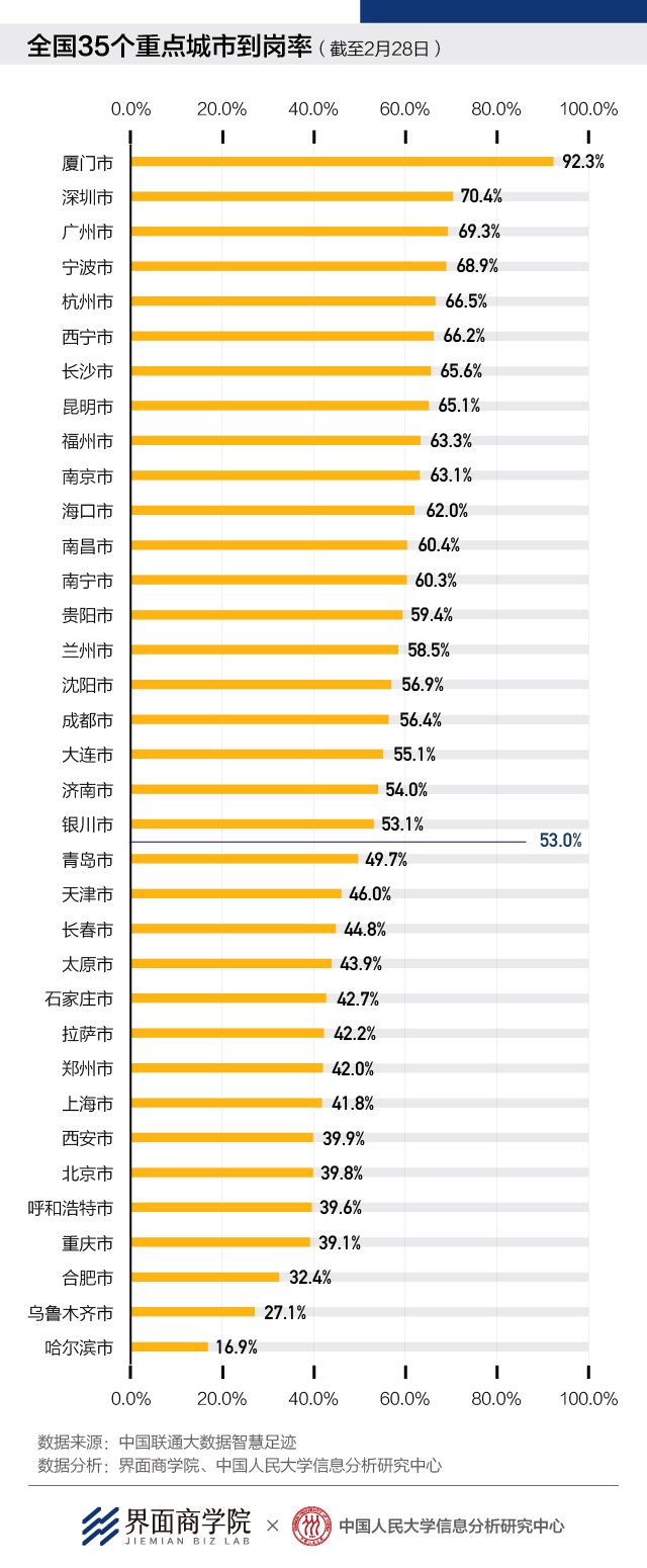 一是35个重点城市的平均到岗率为53.0%,城市分布集中度较高,原因可能在于城市对本地疫情扩散风险的判断标准较为一致。