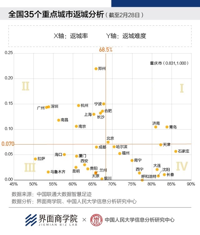 二是重庆返城难度和返城率“双高”表现相对“积极”(图中只标注了数值),落在第I象限的济南和青岛也值得关注,但这种“积极”也可能意味着当地采取了不一样的“外防输入”标准。