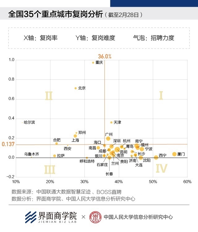 一是35个重点城市平均复岗率为36.0%,大部分城市集中于第IV象限的“稳健”状态,即复岗难度低、复岗率高、招聘力度较大,中小城市招聘力度表现突出。
