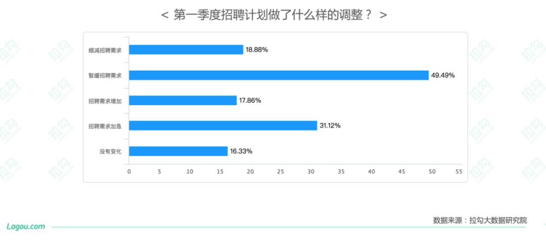 拉勾方面提供《深网》数据显示,营收较为稳定的中、大型企业招聘需求波动较小,只是暂缓。根据拉勾调研数据显示,招聘计划未受影响的企业仅16.33%;18.88%企业缩减招聘需求;49.49%企业暂缓招聘需求;但也有些企业因基层员工未能如期返工加急招聘需求,这些多为规模较小企业。