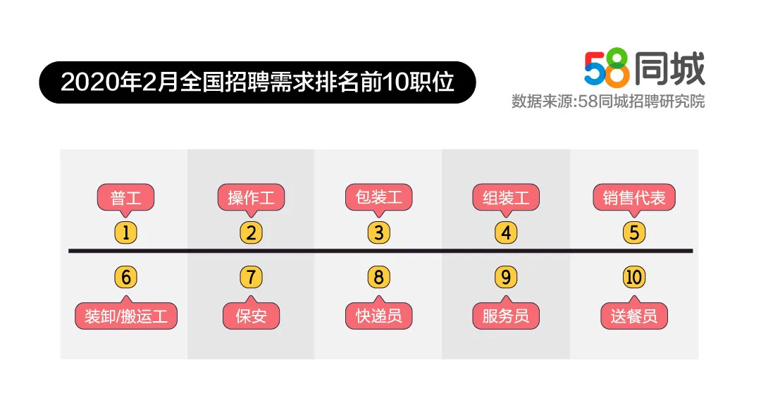 58同城招聘研究院还对招聘需求排名前10的职位进行了统计,排名第一的是普工,其次是操作工、包装工、组装工、销售代表、装卸/搬运工、保安、快递员、服务员及送餐员。为了保障疫期物资供应,口罩、防护服、消毒液等制造业企业开足马力生产加工,上下游企业也加快组织生产,这让普工的招聘需求量激增。