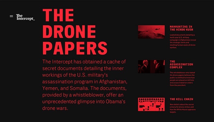 Intercept网站10月15日公布了一项名为“无人机文件”(The Drone Papers)的调查,该调查基于记者Jeremy Scahill和他的多位同事收集到的一系列有关美国政府定点清除计划的秘密文件。
