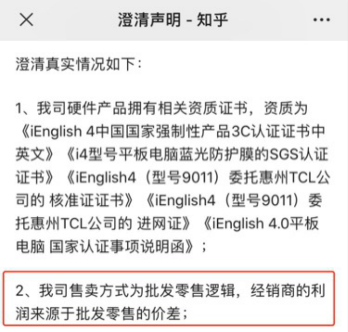 针对外界质疑,iEnglish官方2020年1月在知乎上回应称:“我司售卖方式为批发零售逻辑,经销商利润来源于批发零售的价差。”客服人员也对界面教育表示,iEnglish不是传销,具体理由是:“我们有实体(商品)的。”