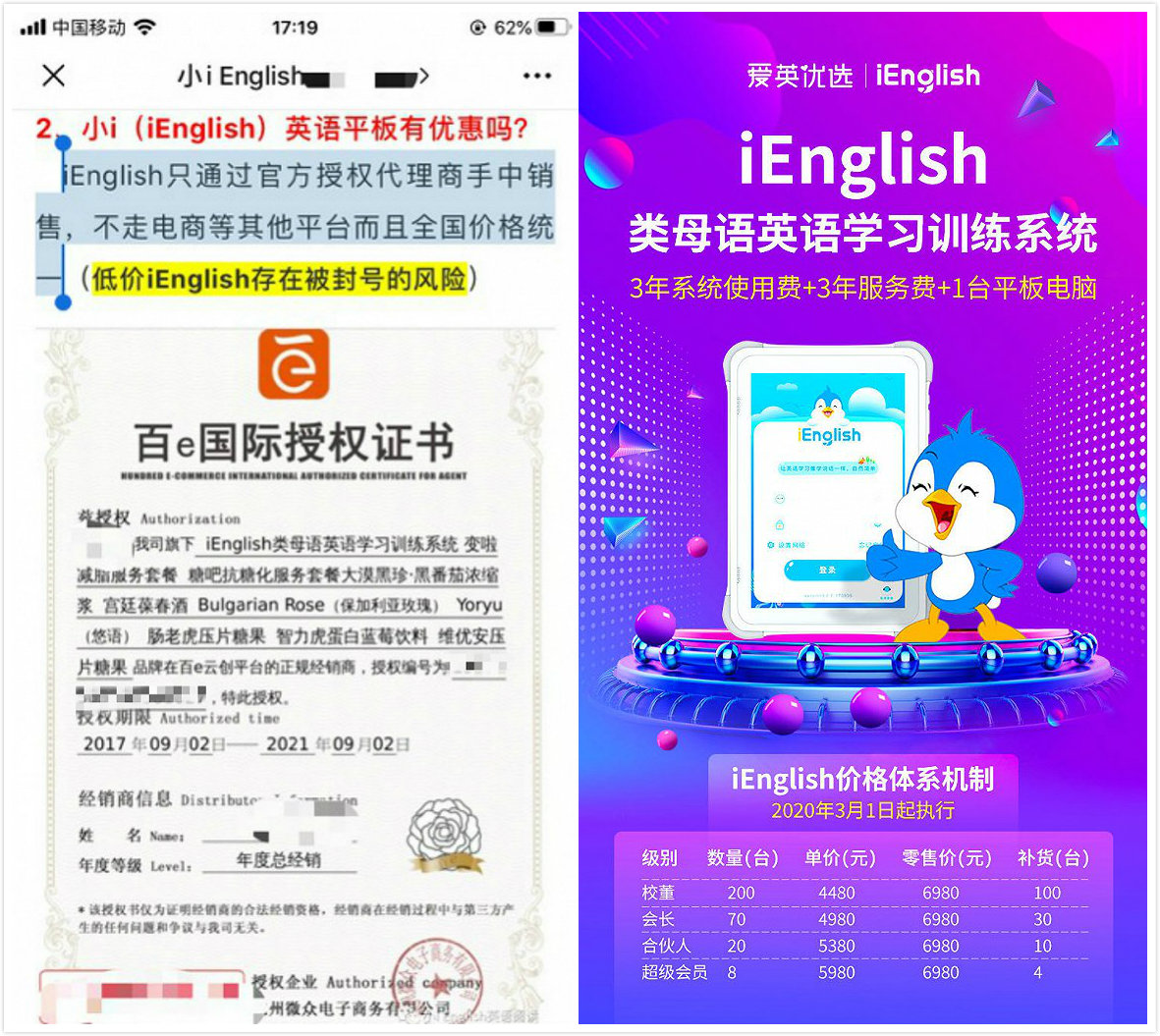 一位自称iEnglish校董高级合伙人的人士在其个人公众号上称,该产品只通过官方授权代理商销售,不走电商等平台。