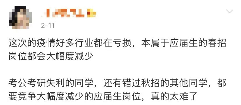“疫情之下,今年应届生找工作可能面临着地狱模式。”即将毕业的杨燕最近忙得焦头烂额,“去年秋招已经很惨烈了,眼下春招的机会更是少得可怜,很多公司不减员就很不错了,哪里还有岗位留给应届生。”