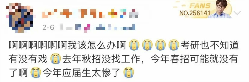 考研成绩不理想的周玉,3月开始踏上找工作这条路。之前为了备战研究生考试,放弃了实习,错过了秋招,找工作谈何容易。更何况,这场突如其来的疫情令应届生开启了就业困难模式,“简历全都石沉大海,失眠到头发一把一把地掉,可是除了待在家里,实时刷招聘信息,其他什么都做不了”,周玉说。
