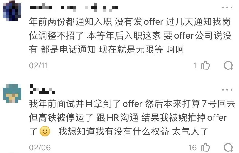 一位网友分享了自己的真实经历,“年前面试拿到了offer,原本回程的高铁停运,在于HR沟通时被委婉推掉offer。”这并非个例,有网友面试的公司通知入职后,仅仅几天就调整岗位不招了,而另外一家公司的入职电话也陷入了无限的等待之中。