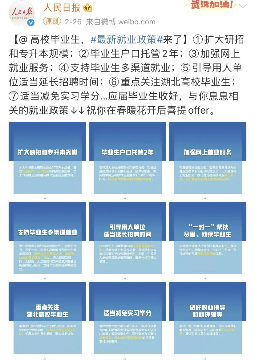 早在2月26日,国家就出台了高校毕业生最新就业政策,其中包括扩大研招和专升本本规模、毕业生户口托管2年、加强网上就业服务、支持毕业生多渠道就业、引导用人单位适当延长招聘时间等9大关键点。