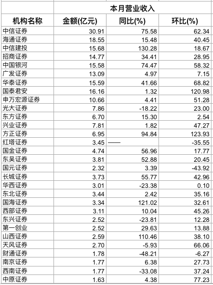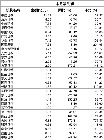 净利润方面,24家券商跨过亿元大关,中信证券是目前唯一一家赚得超过10亿元的券商,当月实现净利11.82亿元,同比增加45%,环比增加37.37%。