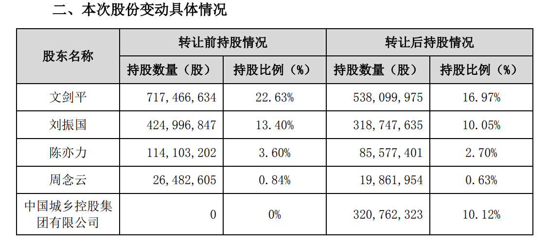 查阅过往公告,去年7月,碧水源实控人文剑平,及股东刘振国、陈亦力、周念云,将手中持有的共计3.21亿股转让给了中国城乡。中国城乡从无到有,一口气持有10.12%的股权,登上第二大股东的位置。原本实控人文剑平持有22.63%的股权,在转让之后其持股比例下降为16.97%,其余人等的持股比例就相应降得更低。上述转让涉及的转让价款总计28.69亿元。