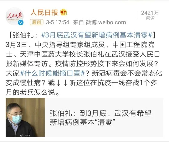 昨日(3 月 5 日),张伯礼院士接受人民日报采访时表示: