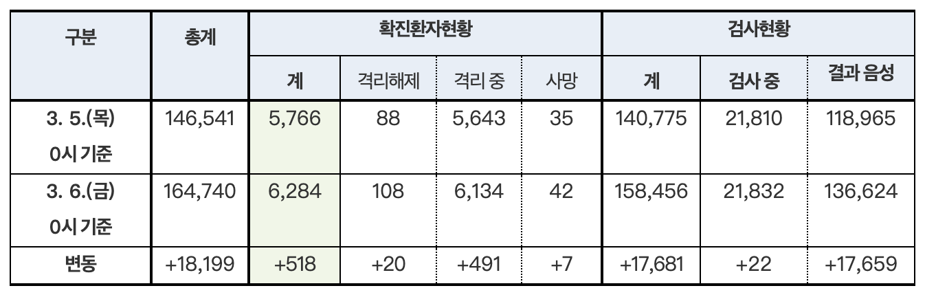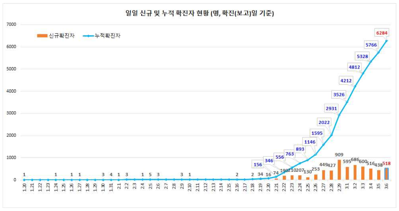 韩国中央防疫对策本部3月6日通报,截至当天零时,韩国较昨日零时新增518例新冠病毒感染病例,较昨日下午4时新增196例,累计确诊6284例,死亡增至42例,治愈增至108例。