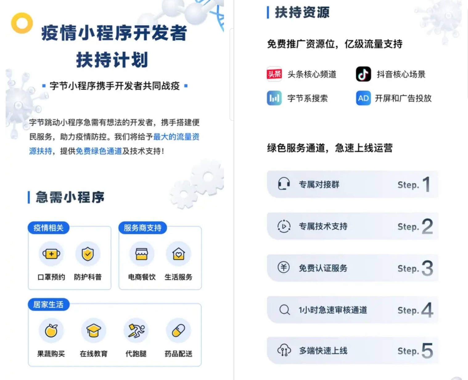 据界面新闻记者了解,此前,今日头条曾上线一个疫情小程序开发者扶持计划,除了疫情资讯、口罩预约外,果蔬、药品配送、在线教育、代跑腿、生活工具等也都在所需小程序范围之内。