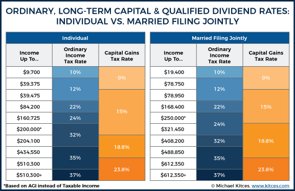 (“一般收入”税率(蓝色)和“资本利得”税率(黄色)在不同的年收入水平下的对比)