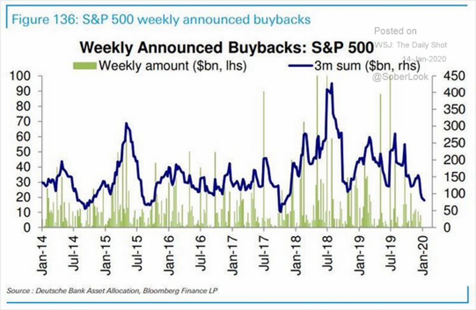 数据显示,标普500指数的股票回购水平,从2018年7月(平均每周)的1000亿美金,已经下降到了2020年1月的100亿美金。同时期标普指数上涨了14%。