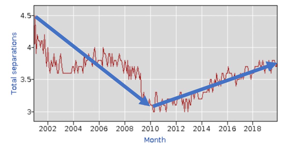 过去20年间,CEO(上图)与普通雇员(下图)的离职率的趋势是高度相似的。也就是说CEO的离职与他们掌握信息的相对多少并没有关系(考虑到高管相对普通员工确实存在信息不对称)。