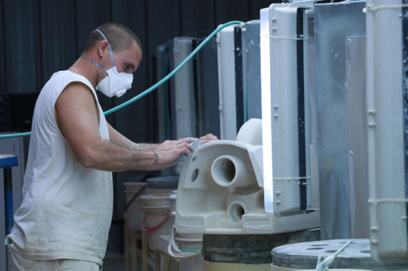 马桶(或称坐浴盆,盥洗池)的制造共分五步,你可以在下面的图片中看到。首先,他们必须准备好主体和釉料的原材料。然后是高压铸造——使液体陶瓷材料具备最终的固体形式的过程。风干(第三步)之后,工业机器人将半成品涂上釉料(第四步)。最后,这些卫生洁具缓慢地通过一个燃烧的通道,在一个长长的窑炉里呆上20小时,里面的最高温度可达1200摄氏度。