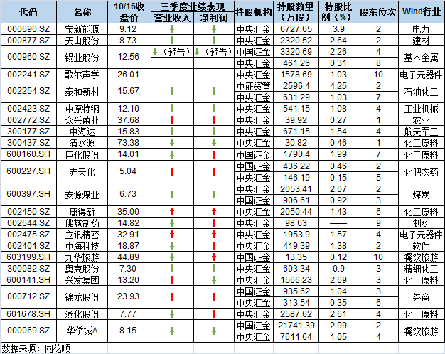 界面新闻整理还发现,共计10家企业出现“双降”,包括宝新能源(000690.SZ)、天山股份(000877.SZ)、泰和新材(002254.SZ)、中原特钢、中海达(300177.SZ)、清水源(300437.SZ)、安源煤业、奥克股份(300082.SZ)、华侨城A(000069.SZ)。仅有5家企业实现“双涨”,分别为众兴菌业(002772.SZ)、赤天化(600227.SH)、康得新(002450.SZ)、立讯精密(002475.SZ)和锦龙股份(000712.SZ)。但值得注意的是,尽管赤天化今年前三季度营业收入和净利润均比去年同期有所增长,但仍处于亏损状态,其1-9月份的净利润为-14238.65万元。赤天化面临的亏损压力不小。生产装置计划检修、产品产量同比大幅减少一直是该企业利润增长的阻力。然而,“国家队”似乎对此无视。根据赤天化三季报显示,中国证金、中央汇金分别持其436.22万股和146.19万股,从而成为其第二、第五大股东。