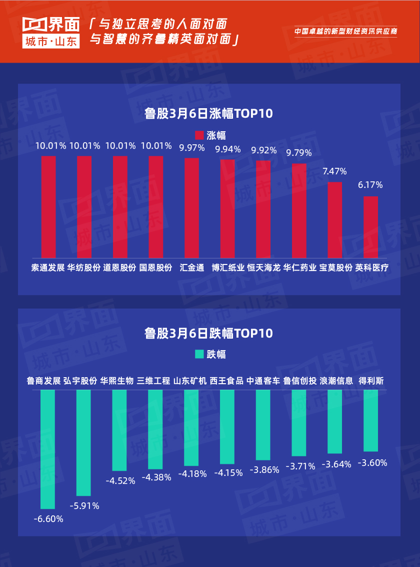 3月6日,山东省内沪深股票有105只个股上涨,98只下跌,5只与上一个交易日收盘价持平;