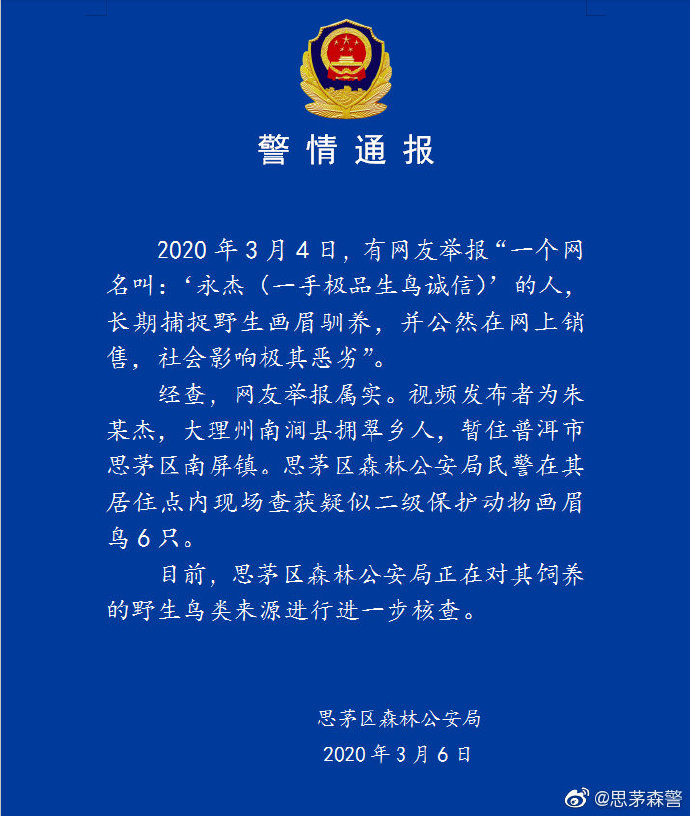 据云南省普洱市思茅区森林公安局官方微博通报,2020年3月4日,有网友举报“一个网名叫:‘永杰(一手极品生鸟诚信)的人,长期捕捉野生画眉驯养,并公然在网上销售,社会影响极其恶劣”。
