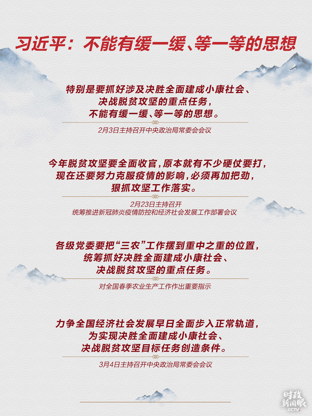 去年3月7日,习近平在甘肃代表团专门谈脱贫攻坚,“不获全胜、决不收兵!”今年3月6日,距离收官已不足10个月,决战决胜脱贫攻坚座谈会在北京召开。习近平在会上说,“到2020年现行标准下的农村贫困人口全部脱贫,是党中央向全国人民作出的郑重承诺,必须如期实现,没有任何退路和弹性。”