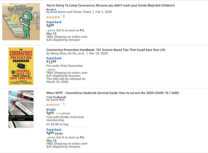 截至美国当地时间3月3日,亚马逊网上书城已经上架了一百多本新型冠状病毒相关作品。从《生存指南》到《完整指南》甚至是《终极指南》,应有尽有。其中许多书都声称介绍了疾病来源、传播方式、预防手段以及如何减轻症状,读者完全不用担心这场疫病会给自己带来多少损失——有一本书的标题就叫作《冠状病毒低成本求生指南》(Surviving Coronavirus on Any Budget)。在这些书目中,大约一半只有不到薄薄50页,最常见的定价是2.99美元。