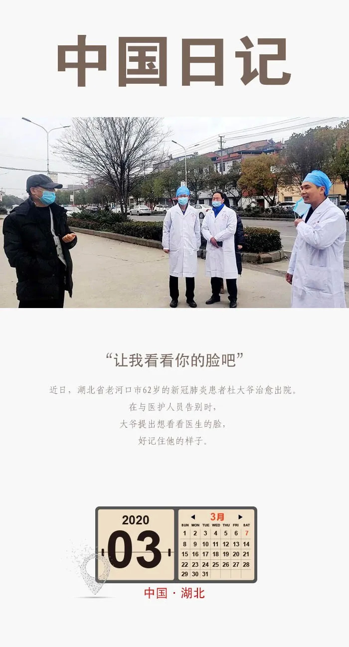 在湖北省老河口市,62岁的新冠肺炎患者杜大爷3月2日治愈出院时,对前来送行的医生周天敏提了这样一个请求:“让我看看你的脸吧。”