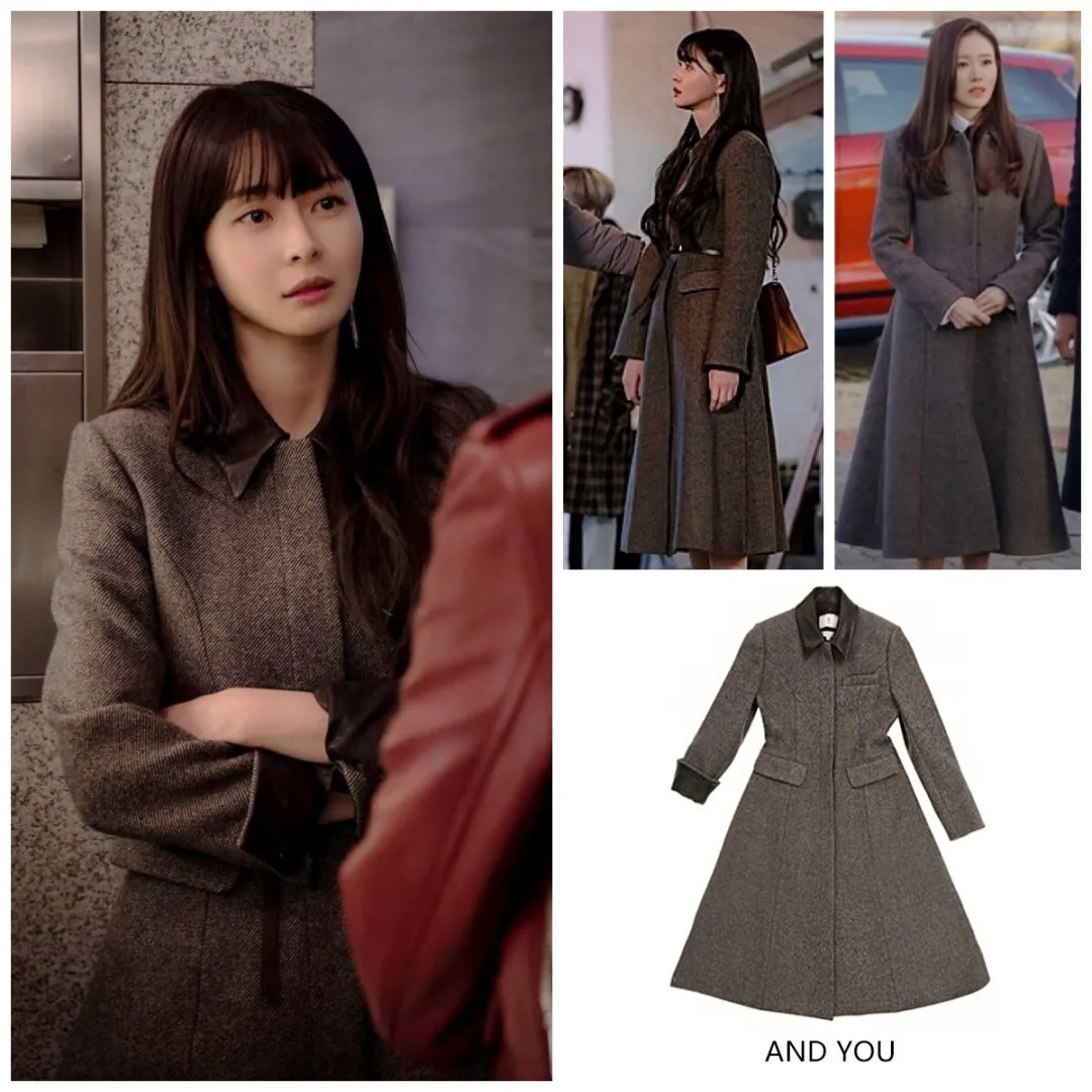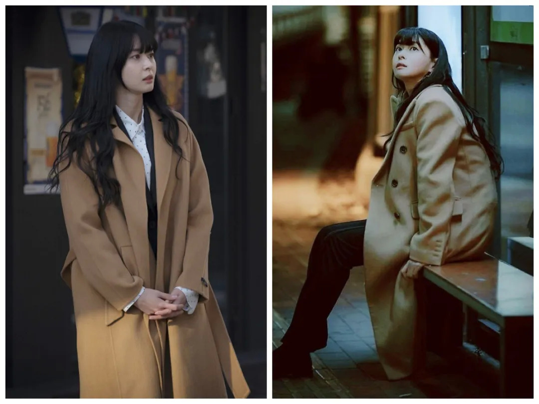 她有一件收腰的裙摆大衣,来自韩国品牌AND YOU,很有60年代的复古感。这件大衣之前孙艺珍在《爱的迫降》里也有穿过: