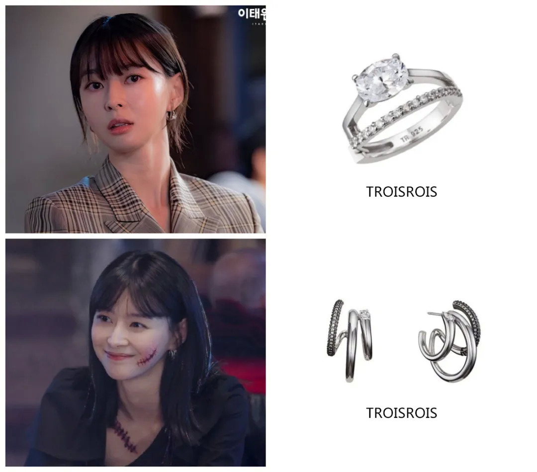 她戴过两款带钻的耳环,全都来自韩国品牌TROIS ROIS。这个牌子的首饰基本都走精致优雅路线,价位在1~1.5K左右。像上面这款戒指耳环还便宜些,大概600+可以买到。