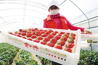 村民在凉山州普格县五道箐草莓基地内采摘草莓。张启泉摄/光明图片