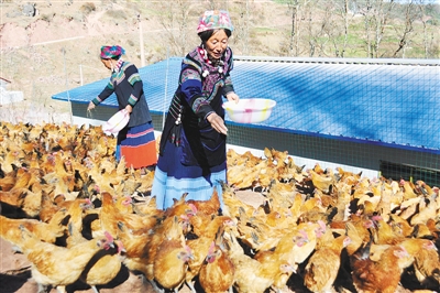 凉山州昭觉县解放乡火普村收古社脱贫致富带头人曲木色畏(右)、阿子尔作在养鸡场喂饲料。成和平摄/光明图片