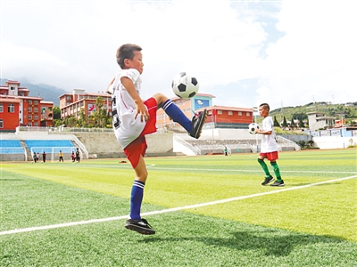 凉山州普格县螺髻山铁道兵希望学校足球队的小队员在训练。杨尚威摄/光明图片