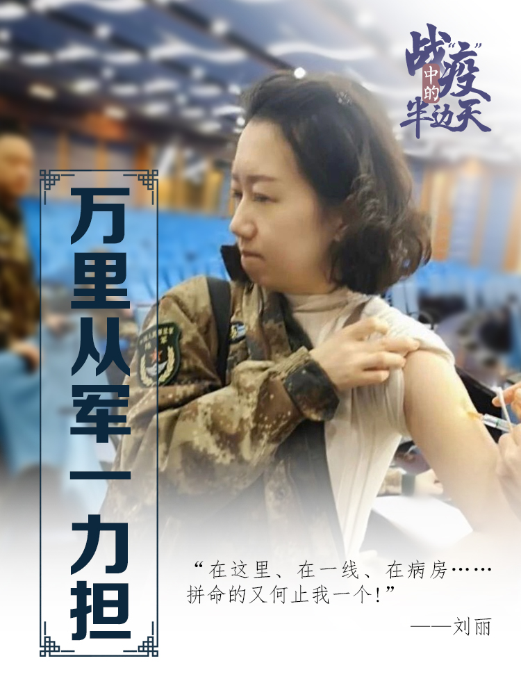 她身着迷彩服,扭着头、抿着嘴,挽起袖子在打针