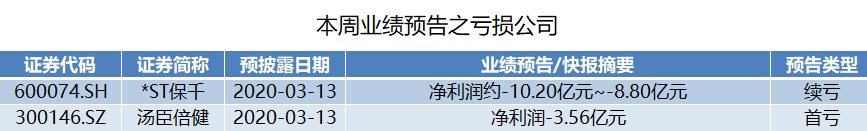 此外,本周业绩披露还需要留意两家亏损公司,一家首亏、一家续亏,分别是汤臣倍健(300146.SZ)、*ST保千(600074.SH)。