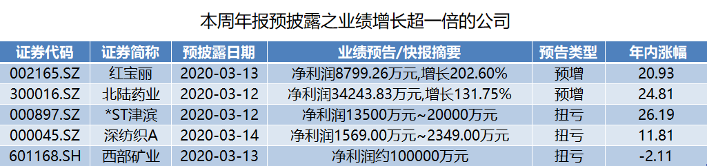 2家公司预计业绩增长一倍以上,分别是红宝丽(002165.SZ)、北陆药业(300016.SZ)。另有3家公司扭亏增长,分别是*ST津滨(000897.SZ)、深纺织A(000045.SZ)、西部矿业(601168.SH)。