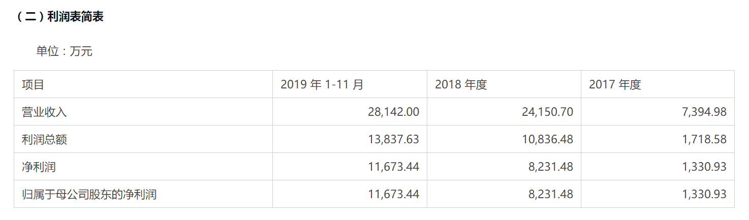 从财报来看,2017年、2018年和2019年1-11月欧立通分别实现营业收入7394.98万元、2.42亿元、2.81亿元;实现净利润1330.93万元、8231.48万元、1.17亿元。