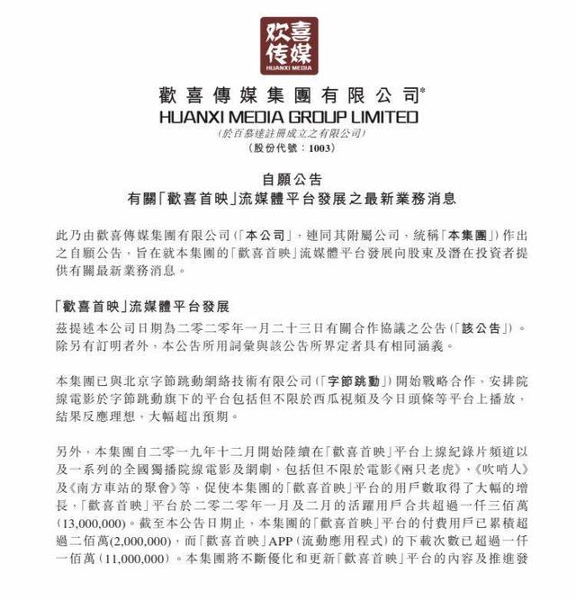 3月5日晚间,欢喜传媒对外发布旗下流媒体平台欢喜首映的最新业务消息。公告显示,欢喜首映从2020年1-2月平台活跃用户合共超过1300万,截至目前,欢喜首映平台的付费用户累积超过200万,欢喜首映APP的下载次数已超过1100万次。