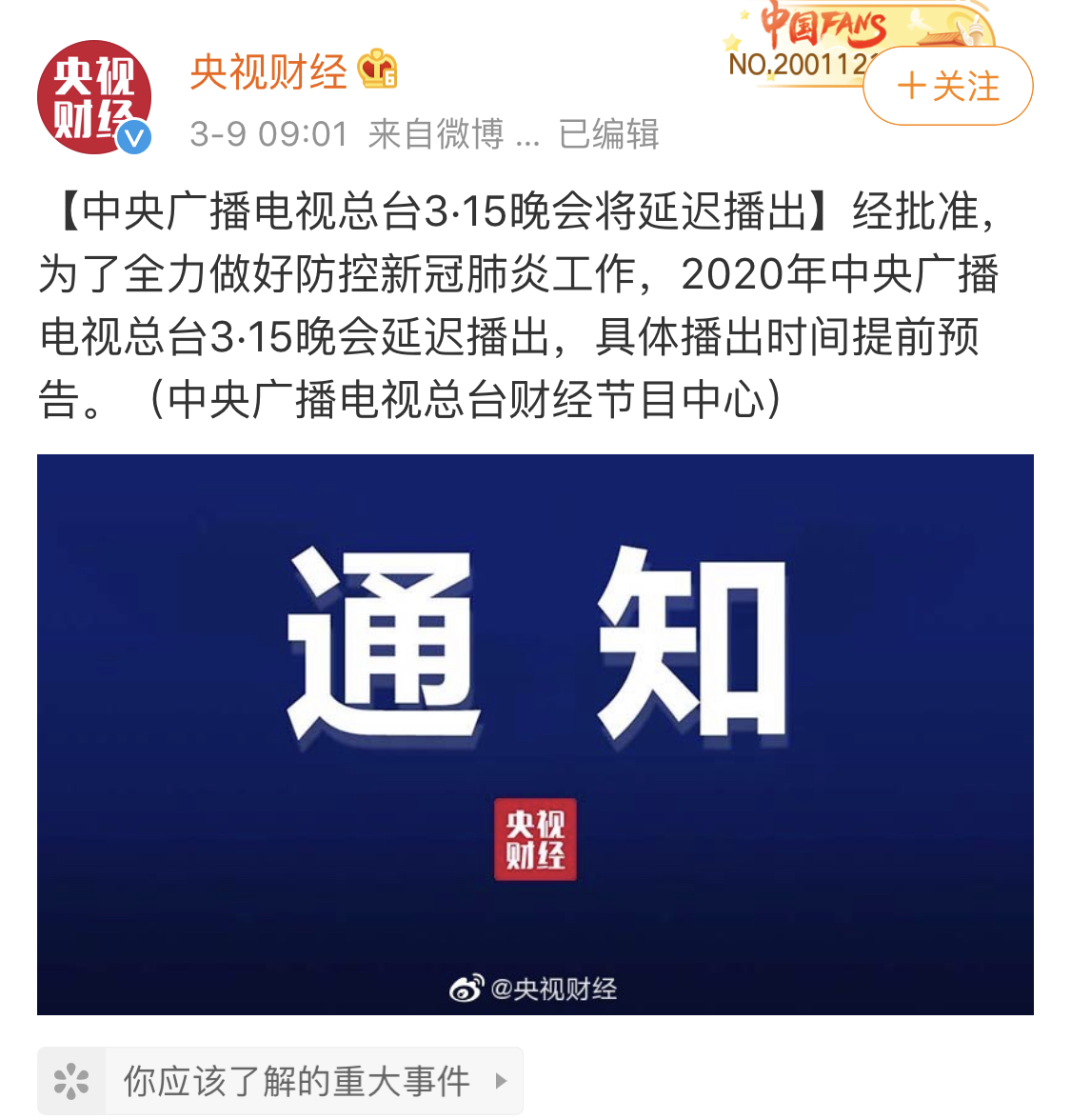 根据@央视财经官方微博在3月9日9点发布的消息,中央广播电视总台财经节目中心表示经批准,为了全力做好防控新冠肺炎工作,2020年中央广播电视总台3·15晚会延迟播出,具体播出时间提前预告。