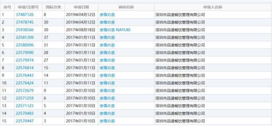 通过商标网检索得知,奈雪の茶运营主体——深圳市品道餐饮管理有限公司共提交注册了16件“奈雪の茶”商标,涵盖了多个类别。但2019年4月12日才提交注册的第37478745号30类商标指定使用在咖啡;茶;茶饮料;蜂蜜等方面,还处在等待实质审查阶段,尚未正式注册成功。