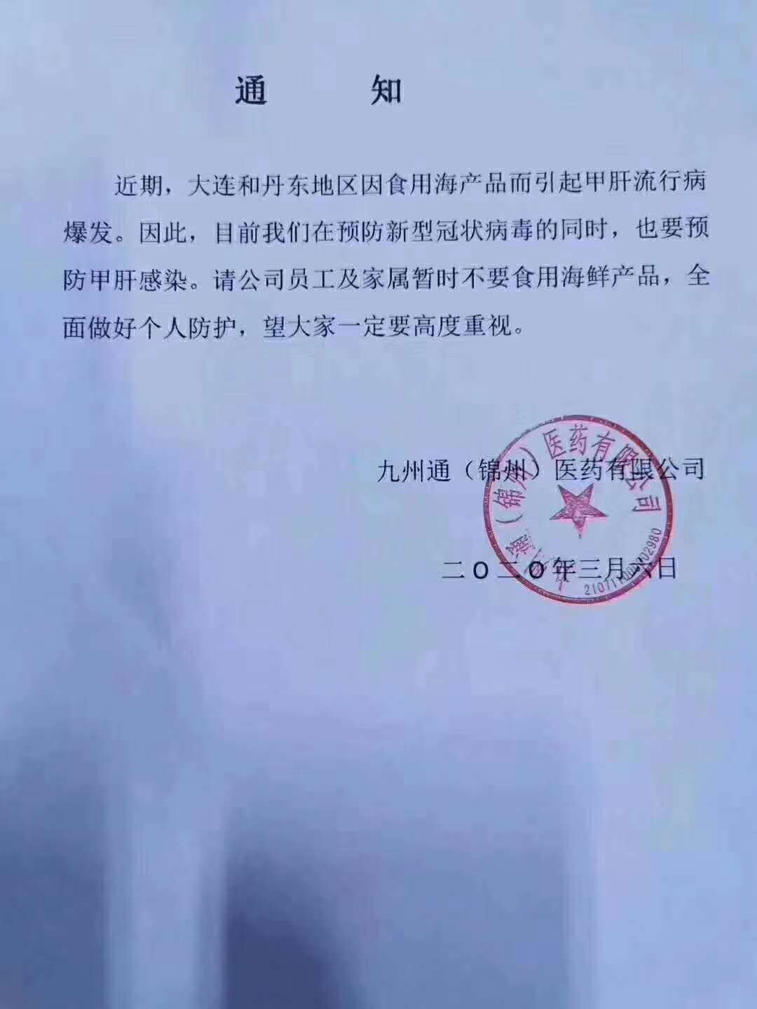3月7日,一落款九州通(锦州)医药有限公司并加盖公章的《通知》流出,《通知》内容显示,“近期,大连和丹东地区因食用海产品而引起甲肝流行病爆发。因此,目前我们在预防新型冠状病毒的同事,也要预防甲肝感染。”