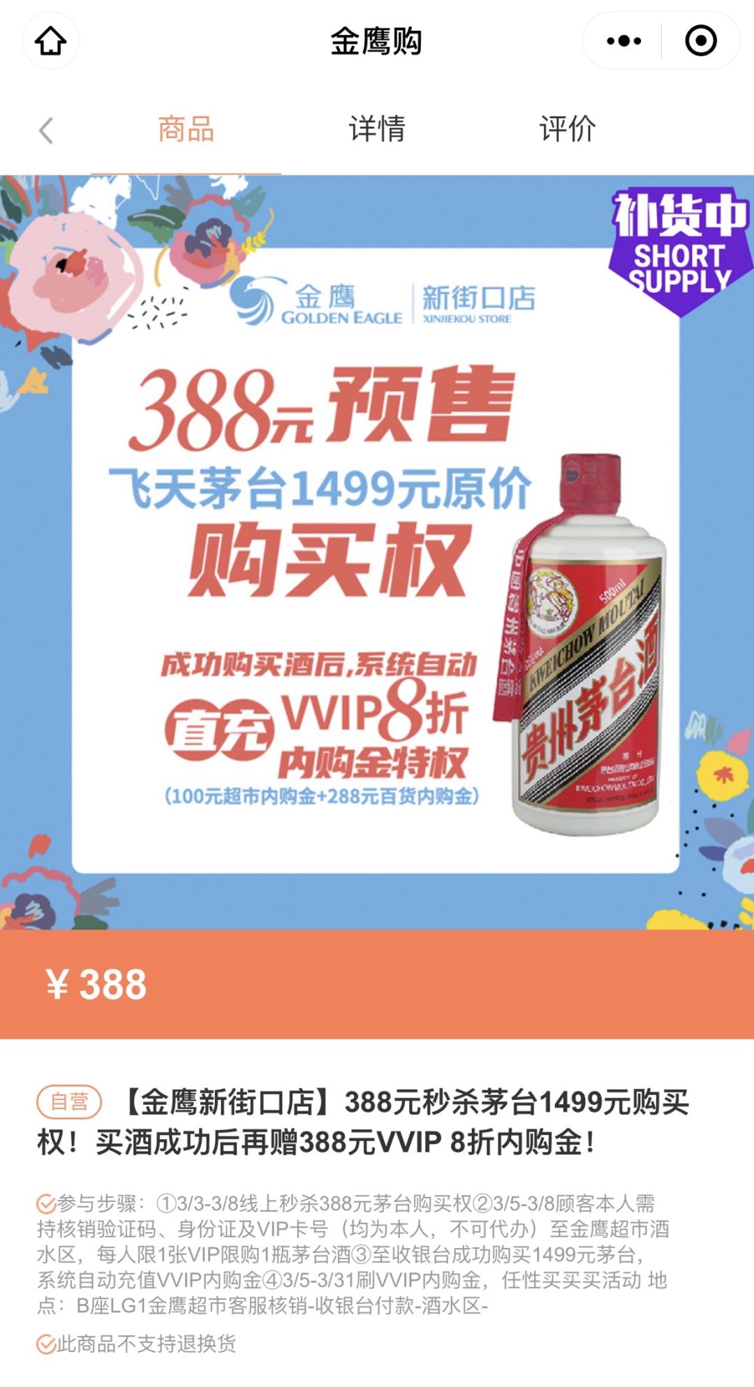 江苏金鹰则推出了“388元秒杀茅台酒购买权”的活动。在该商超的小程序“金鹰购”上,茅粉需要在活动时间(3月3日-8日)内先花388元去抢茅台酒购买权,一旦秒杀成功,即可在指定期间内,本人凭核销码、身份证和VIP卡号到金鹰超市限购一瓶飞天茅台。也意味着,这瓶茅台酒需要花费1887元(388+1499元)才可到手。